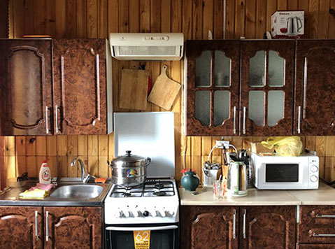 В комнате: санузел в номере, цифровое телевидение, кровать, шкаф-прихожая, стол и стулья, чайник, столовые приборы, холодильник.